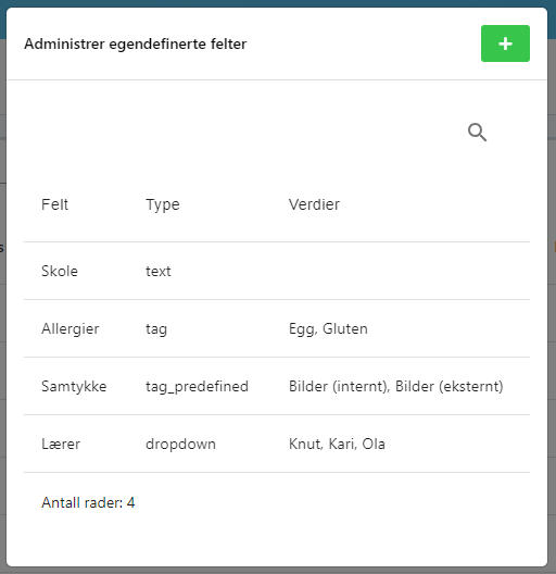 For at oprette et nyt felt skal du trykke på den grønne "+"-knap i øverste højre hjørne.