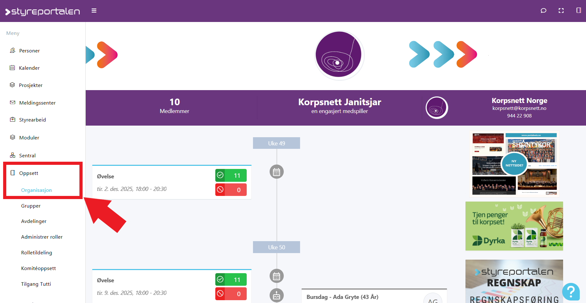 For å se info om korpset i Styreportalen trykk på "Oppsett --> Organisasjon":